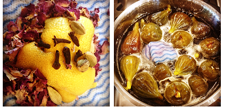 While figs are poaching make a little spice bag containing the lemon peel, rose petals and spices using cheese cloth or a little square of chux cloth, tie securely with kitchen twine and reserve.
