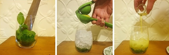 - Place mint in a highball or your choice of glass and muddle (bruise)