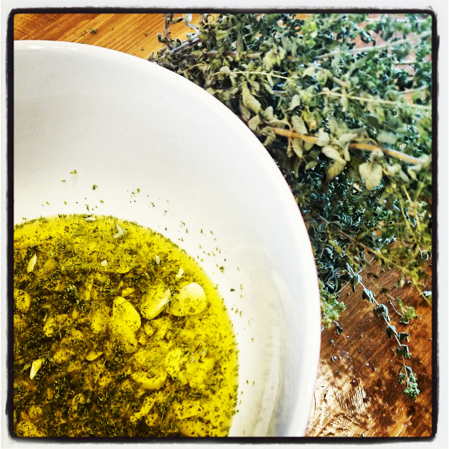 - While Zucchini is draining, mix garlic, oil, oregano and bay leaf in a large mixing