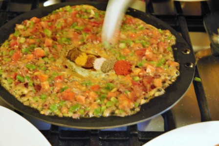Add green chilies, fry briefly then add the tomatoes and fry until mushy, then and add capsicum and dry ground spices.