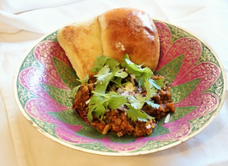 To serve, garnish each portion of bhaji with a teaspoon of butter, some chopped onion, coriander leaves and serve with the toasted “Pavs” (you can also serve some fresh lime wedges to the side if you like)